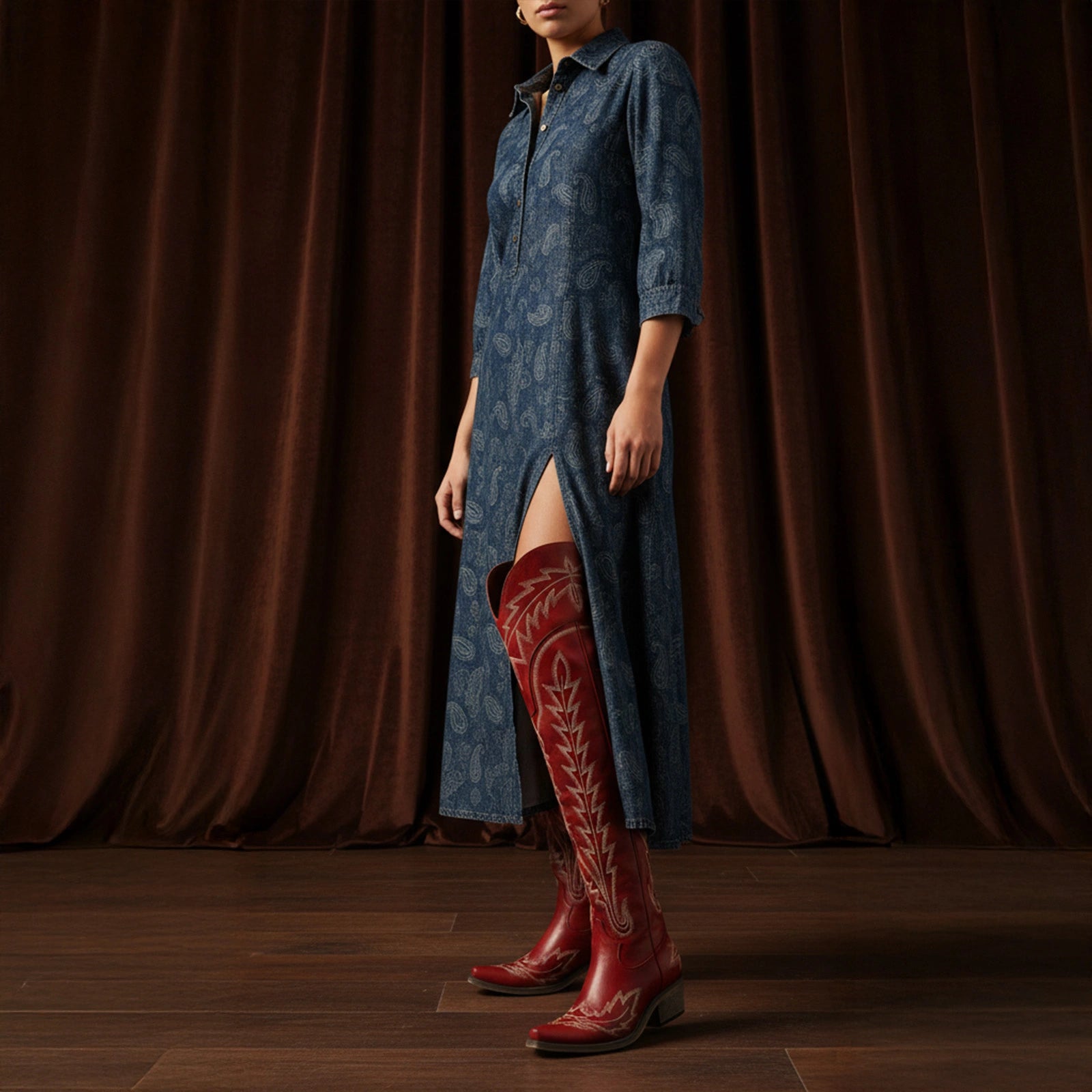 The Crimson Fire – Red Wide Calf Over-the-knee Cowgirl Boots with Fire Embroidery
