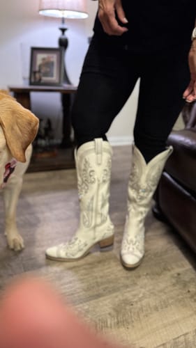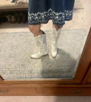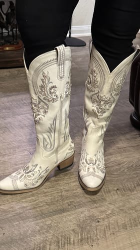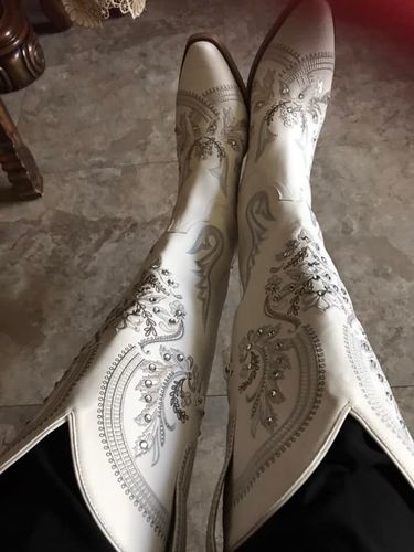 Step into style with The Aurelia Women's Knee-High Cowboy Boots, featuring a beautifully crafted snip toe and delicate floral embroidery adorned with shimmering rhinestones. Made from high-quality synthetic leather, these boots offer a chic, modern take on the classic cowboy style. The soft, breathable mesh lining and cushioned insole ensure all-day comfort, while the stunning embellished design adds a touch of glamour to any outfit.