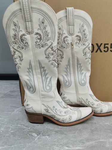 Step into style with The Aurelia Women's Knee-High Cowboy Boots, featuring a beautifully crafted snip toe and delicate floral embroidery adorned with shimmering rhinestones. Made from high-quality vegan leather, these boots offer a chic, modern take on the classic cowboy style. The soft, breathable mesh lining and cushioned insole ensure all-day comfort, while the stunning embellished design adds a touch of glamour to any outfit.